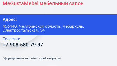 MeGustaMebel, мебельный салон по адресу 456440, Челябинская область, Чебаркуль, Электростальская, 34 в дальнейшем Организация, размещена в следующих категориях: