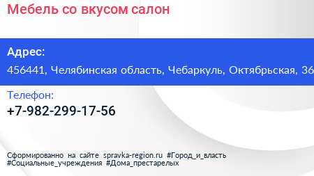 Мебель со вкусом, салон по адресу 456441, Челябинская область, Чебаркуль, Октябрьская, 36 в дальнейшем Организация, размещена в следующих категориях: