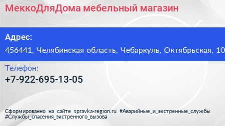 МеккоДляДома, мебельный магазин по адресу 456441, Челябинская область, Чебаркуль, Октябрьская, 10 в дальнейшем Организация, размещена в следующих категориях:
