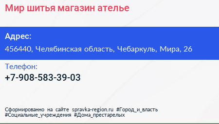Мир шитья, магазин-ателье по адресу 456440, Челябинская область, Чебаркуль, Мира, 26 в дальнейшем Организация, размещена в следующих категориях: