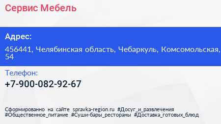 Сервис Мебель по адресу 456441, Челябинская область, Чебаркуль, Комсомольская, 54 в дальнейшем Организация, размещена в следующих категориях: