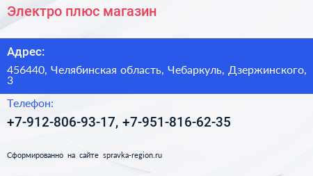 Электро+плюс, магазин по адресу 456440, Челябинская область, Чебаркуль, Дзержинского, 3 в дальнейшем Организация, размещена в следующих категориях:
