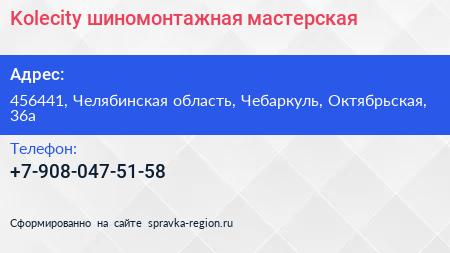 Kolecity, шиномонтажная мастерская по адресу 456441, Челябинская область, Чебаркуль, Октябрьская, 36а в дальнейшем Организация, размещена в следующих категориях: