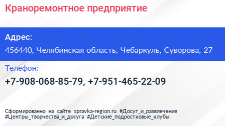 Краноремонтное предприятие по адресу 456440, Челябинская область, Чебаркуль, Суворова, 27 в дальнейшем Организация, размещена в следующих категориях: