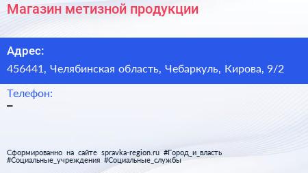Магазин метизной продукции по адресу 456441, Челябинская область, Чебаркуль, Кирова, 9/2 в дальнейшем Организация, размещена в следующих категориях: