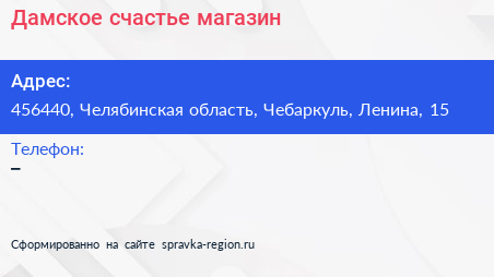 Дамское счастье, магазин по адресу 456440, Челябинская область, Чебаркуль, Ленина, 15 в дальнейшем Организация, размещена в следующих категориях: