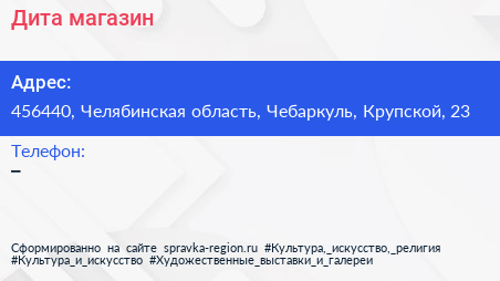 Дита, магазин по адресу 456440, Челябинская область, Чебаркуль, Крупской, 23 в дальнейшем Организация, размещена в следующих категориях: