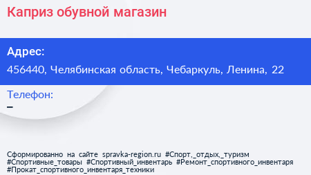 Каприз, обувной магазин по адресу 456440, Челябинская область, Чебаркуль, Ленина, 22 в дальнейшем Организация, размещена в следующих категориях: