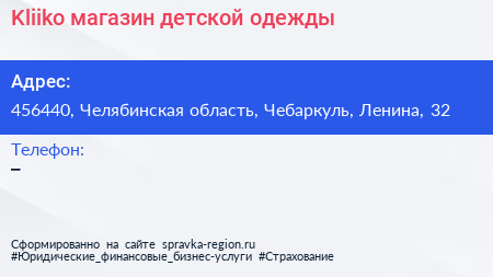 Kliiko, магазин детской одежды по адресу 456440, Челябинская область, Чебаркуль, Ленина, 32 в дальнейшем Организация, размещена в следующих категориях: