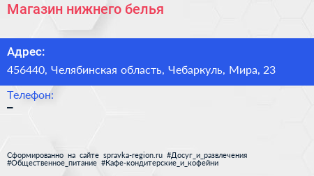 Магазин нижнего белья по адресу 456440, Челябинская область, Чебаркуль, Мира, 23 в дальнейшем Организация, размещена в следующих категориях:
