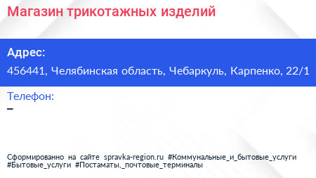 Магазин трикотажных изделий по адресу 456441, Челябинская область, Чебаркуль, Карпенко, 22/1 в дальнейшем Организация, размещена в следующих категориях: