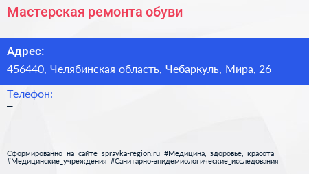 Мастерская ремонта обуви по адресу 456440, Челябинская область, Чебаркуль, Мира, 26 в дальнейшем Организация, размещена в следующих категориях: