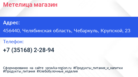 Метелица, магазин по адресу 456440, Челябинская область, Чебаркуль, Крупской, 23 в дальнейшем Организация, размещена в следующих категориях: