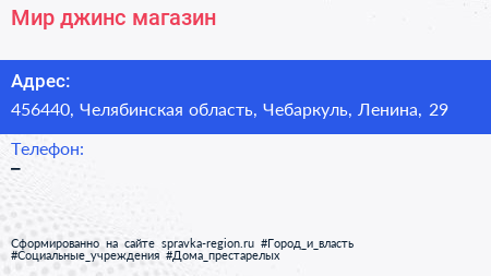 Мир джинс, магазин по адресу 456440, Челябинская область, Чебаркуль, Ленина, 29 в дальнейшем Организация, размещена в следующих категориях: