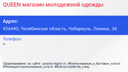 QUEEN, магазин молодежной одежды по адресу 456440, Челябинская область, Чебаркуль, Ленина, 36 в дальнейшем Организация, размещена в следующих категориях: