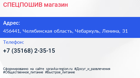 СПЕЦПОШИВ, магазин по адресу 456441, Челябинская область, Чебаркуль, Ленина, 31 в дальнейшем Организация, размещена в следующих категориях: