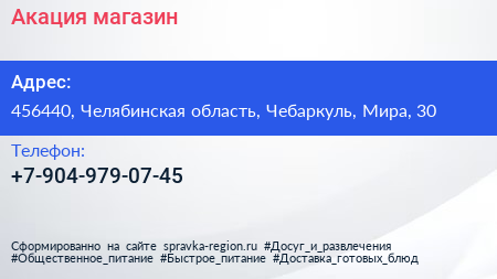Акация, магазин по адресу 456440, Челябинская область, Чебаркуль, Мира, 30 в дальнейшем Организация, размещена в следующих категориях: