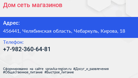 Дом, сеть магазинов по адресу 456441, Челябинская область, Чебаркуль, Кирова, 18 в дальнейшем Организация, размещена в следующих категориях: