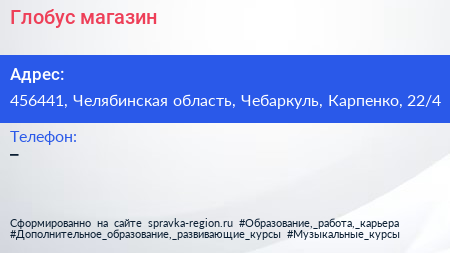 Глобус, магазин по адресу 456441, Челябинская область, Чебаркуль, Карпенко, 22/4 в дальнейшем Организация, размещена в следующих категориях:
