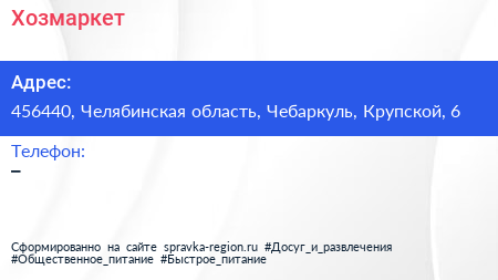 Хозмаркет по адресу 456440, Челябинская область, Чебаркуль, Крупской, 6 в дальнейшем Организация, размещена в следующих категориях: