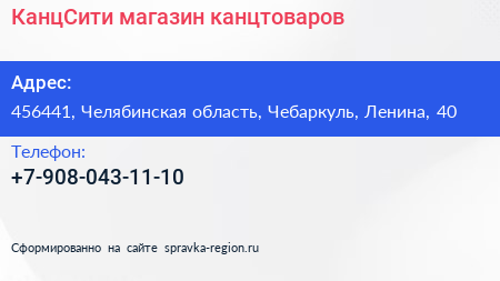 КанцСити, магазин канцтоваров по адресу 456441, Челябинская область, Чебаркуль, Ленина, 40 в дальнейшем Организация, размещена в следующих категориях: