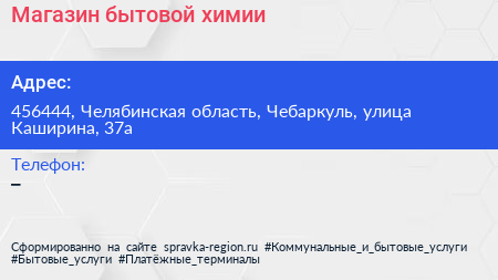 Магазин бытовой химии по адресу 456444, Челябинская область, Чебаркуль, улица Каширина, 37а в дальнейшем Организация, размещена в следующих категориях: