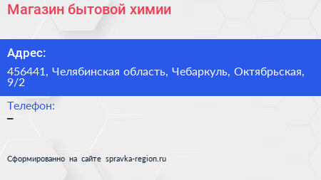 Магазин бытовой химии по адресу 456441, Челябинская область, Чебаркуль, Октябрьская, 9/2 в дальнейшем Организация, размещена в следующих категориях: