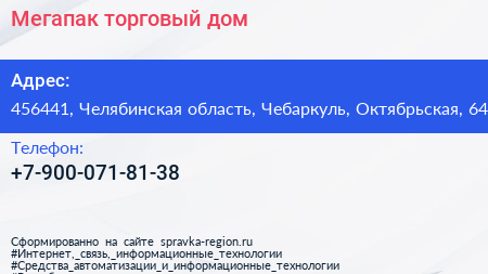 Мегапак, торговый дом по адресу 456441, Челябинская область, Чебаркуль, Октябрьская, 64 в дальнейшем Организация, размещена в следующих категориях: