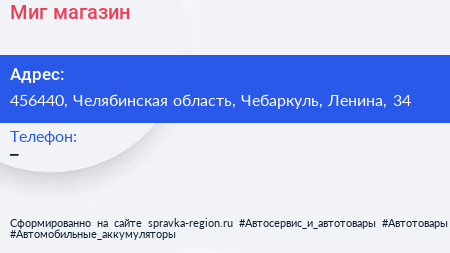 Миг, магазин по адресу 456440, Челябинская область, Чебаркуль, Ленина, 34 в дальнейшем Организация, размещена в следующих категориях: