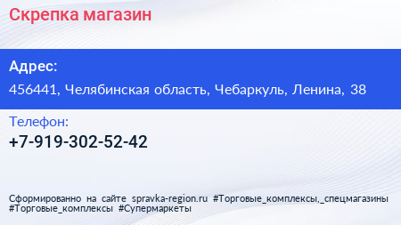 Скрепка, магазин по адресу 456441, Челябинская область, Чебаркуль, Ленина, 38 в дальнейшем Организация, размещена в следующих категориях:
