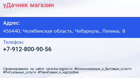 уДачник, магазин по адресу 456440, Челябинская область, Чебаркуль, Ленина, 8 в дальнейшем Организация, размещена в следующих категориях: