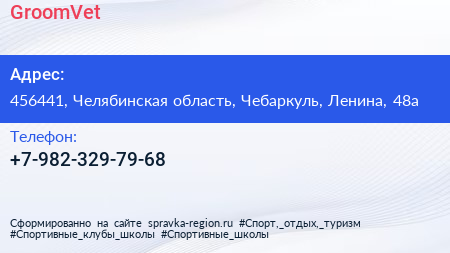 GroomVet по адресу 456441, Челябинская область, Чебаркуль, Ленина, 48а в дальнейшем Организация, размещена в следующих категориях: