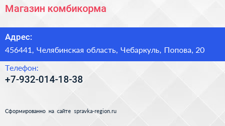 Магазин комбикорма по адресу 456441, Челябинская область, Чебаркуль, Попова, 20 в дальнейшем Организация, размещена в следующих категориях: