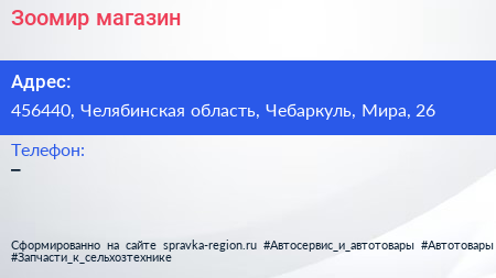 Зоомир, магазин по адресу 456440, Челябинская область, Чебаркуль, Мира, 26 в дальнейшем Организация, размещена в следующих категориях: