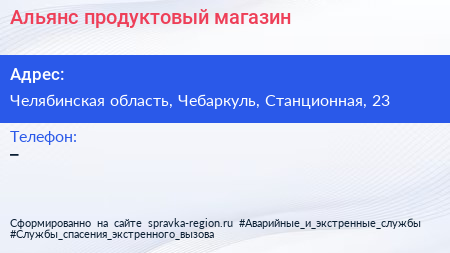 Альянс, продуктовый магазин по адресу Челябинская область, Чебаркуль, Станционная, 23 в дальнейшем Организация, размещена в следующих категориях: