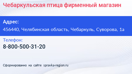 Чебаркульская птица, фирменный магазин по адресу 456440, Челябинская область, Чебаркуль, Суворова, 1а в дальнейшем Организация, размещена в следующих категориях: