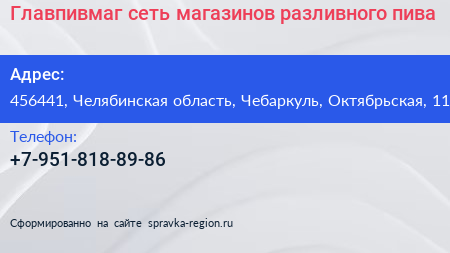Главпивмаг, сеть магазинов разливного пива по адресу 456441, Челябинская область, Чебаркуль, Октябрьская, 11 в дальнейшем Организация, размещена в следующих категориях: