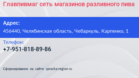 Главпивмаг, сеть магазинов разливного пива по адресу 456440, Челябинская область, Чебаркуль, Карпенко, 1 в дальнейшем Организация, размещена в следующих категориях: