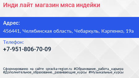 Инди лайт, магазин мяса индейки по адресу 456441, Челябинская область, Чебаркуль, Карпенко, 19а в дальнейшем Организация, размещена в следующих категориях: