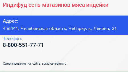 Индифуд, сеть магазинов мяса индейки по адресу 456441, Челябинская область, Чебаркуль, Ленина, 31 в дальнейшем Организация, размещена в следующих категориях:
