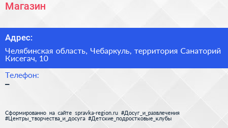 Магазин по адресу Челябинская область, Чебаркуль, территория Санаторий Кисегач, 10 в дальнейшем Организация, размещена в следующих категориях: