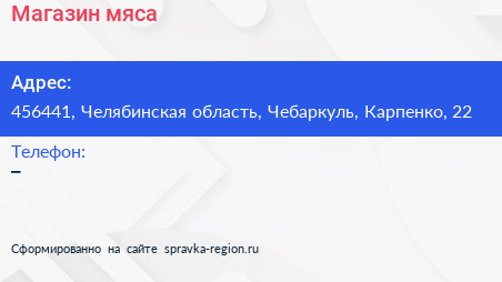 Магазин мяса по адресу 456441, Челябинская область, Чебаркуль, Карпенко, 22 в дальнейшем Организация, размещена в следующих категориях: