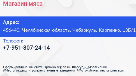 Магазин мяса по адресу 456440, Челябинская область, Чебаркуль, Карпенко, 13Б/1 в дальнейшем Организация, размещена в следующих категориях: