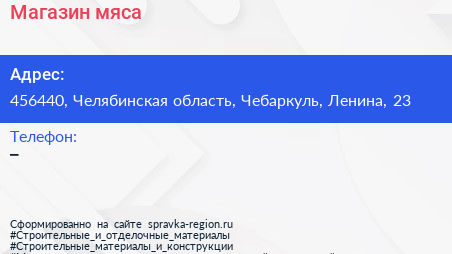 Магазин мяса по адресу 456440, Челябинская область, Чебаркуль, Ленина, 23 в дальнейшем Организация, размещена в следующих категориях: