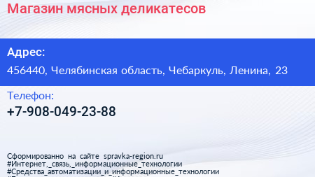 Магазин мясных деликатесов по адресу 456440, Челябинская область, Чебаркуль, Ленина, 23 в дальнейшем Организация, размещена в следующих категориях: