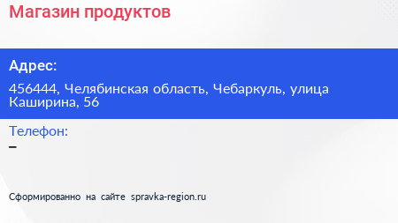 Магазин продуктов по адресу 456444, Челябинская область, Чебаркуль, улица Каширина, 56 в дальнейшем Организация, размещена в следующих категориях: