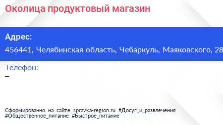 Околица, продуктовый магазин по адресу 456441, Челябинская область, Чебаркуль, Маяковского, 28 в дальнейшем Организация, размещена в следующих категориях: