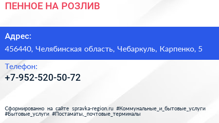 ПЕННОЕ НА РОЗЛИВ по адресу 456440, Челябинская область, Чебаркуль, Карпенко, 5 в дальнейшем Организация, размещена в следующих категориях: