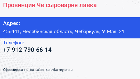 Провинция Че, сыроварня-лавка по адресу 456441, Челябинская область, Чебаркуль, 9 Мая, 21 в дальнейшем Организация, размещена в следующих категориях: