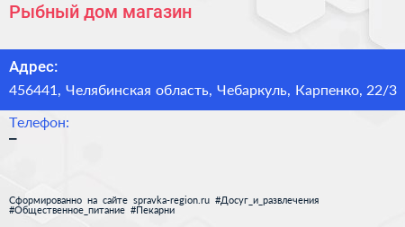 Рыбный дом, магазин по адресу 456441, Челябинская область, Чебаркуль, Карпенко, 22/3 в дальнейшем Организация, размещена в следующих категориях:
